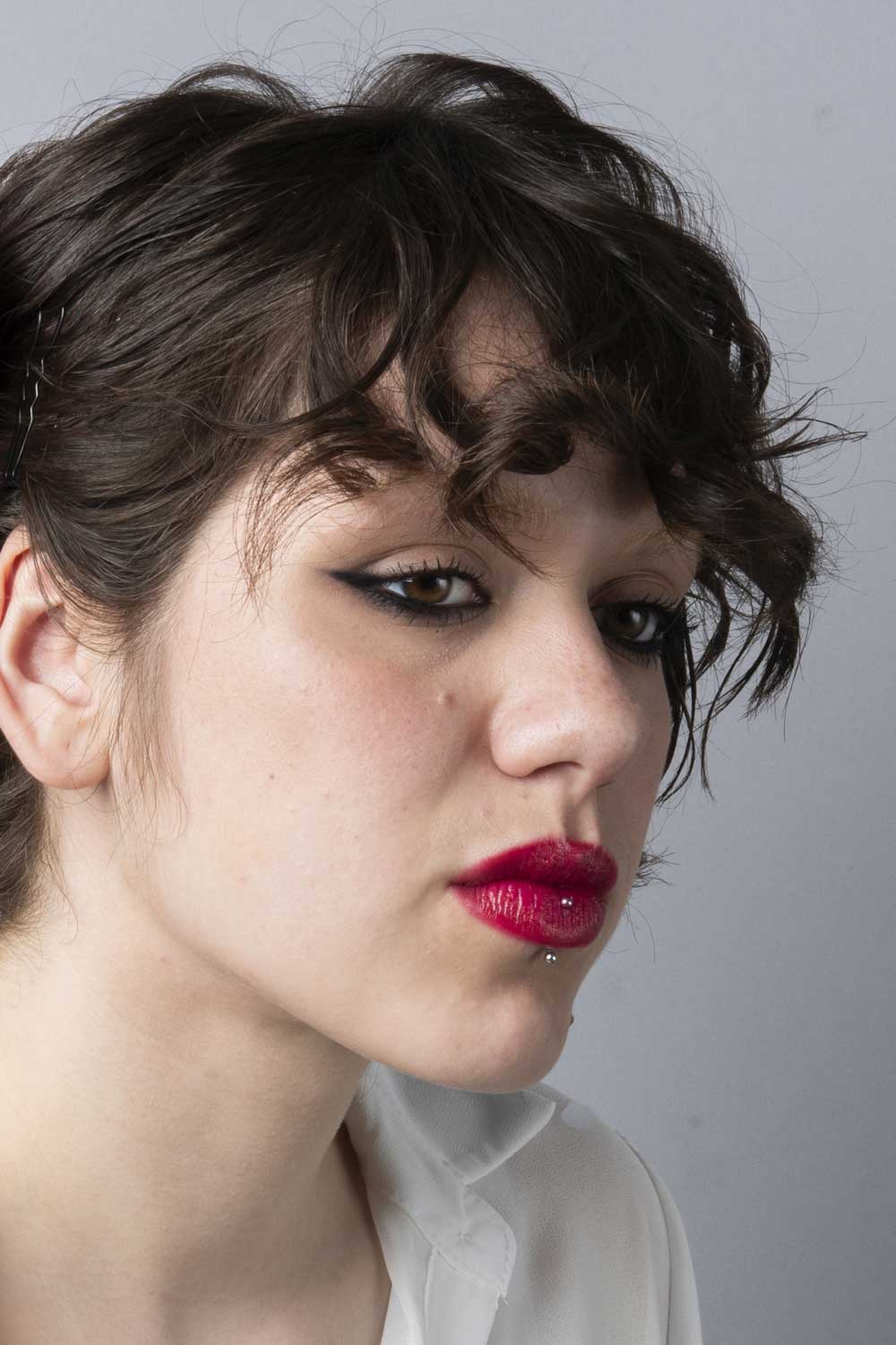 Occhi, sopracciglia e labbra rifiniti con precisione, per un risultato elegante e fotografico.